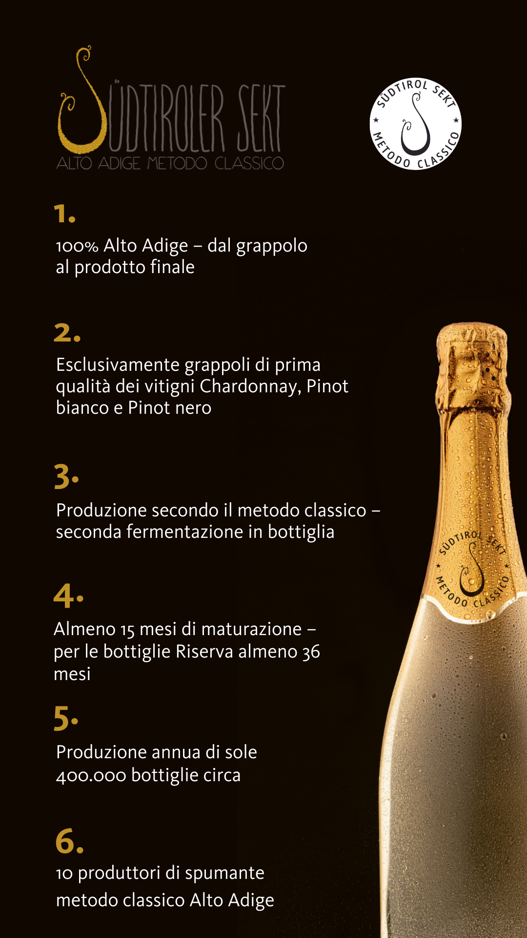 La dicitura “Südtirol Sekt” sottolinea che il contenuto delle bottiglie è al 100 per cento altoatesino, dai grappoli fino al prodotto finale. Possono essere utilizzati solo grappoli dell’Alto Adige di prima qualità ed esclusivamente dei vitigni Chardonnay, Pinot bianco e Pinot nero, e l’intero processo produttivo deve avvenire in Alto Adige.